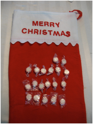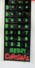 Make a candy count down. This one is a felt stocking from a dollar store. Sew short lengths of ribbon to tie on each piece of candy, or do it the lazy man’s way and just stick the candy on with double stick tape. The base doesn’t have to be a stocking--it could be any Christmas shape--a star, bell, wreath, etc. It doesn’t have to be felt, either--it can be made of poster board, cardboard, plastic or even wood. Sometimes dollar stores sell advent calendars with pockets already made, so all you have to do is fill the pockets with candy. If the pockets can only hold one piece in each pocket, your kids will have to take turns, or you will need to buy one set of pockets for each child. If your dollar store doesn’t have anything that will work, don’t give up--keep looking. You might find something that isn’t made to be an advent calendar, but has pockets. The pockets shown on the far left were made for keeping track of taking pills. I added the numbers, holly leaves and words. Of course, you sew, you can make your own stocking or pockets.