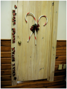 I bought this one at a dollar store, but it didn’t look like this when I bought it. The chalkboard only had a plain white border, but I could see the potential, especially since it came with chalk and an eraser on strings. I bought the snowman decoration at the dollar store, too, and glued it to the top, then I painted some red stripes around the frame to make it look more Christmasy.