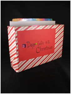 Cut a window in the box, and fasten a paper plate to the inside with a brad. The top should just show enough over the top that you can turn it to the next number. (see photo above, left--the plate is pink.) You may need to cut the rim off the plate to make it lie close enough to fasten it with a brad. You could use a circle of poster board instead the plate. Write a number in the window, and keep turning the plate and writing numbers until you get down to one (or zero.) If you would rather spend money than time, buy an accordion folder instead. Buy 24 folders, or make them out of construction paper folded in half. Mark each one with a number from 24 down to one (or zero.) Each day your children will take turns turning the wheel for the Christmas countdown, then pulling out the folder to discover a fun Christmas activity to do. The empty folder can go in the back of the other folders, or, if you think your children might get confused, you can put it in another place until the Christmas season is over.