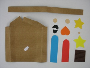 Download the pattern for the barn and cut out of brown paper. The one shown here is made from corrugated paper for added texture. Since the back of the paper is a different color from the front, the sides of the barn have to be double so they are the same on both the inside and outside of the barn. If your paper is the same on front and back, you can leave off those extra flaps on both sides.