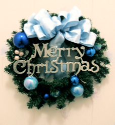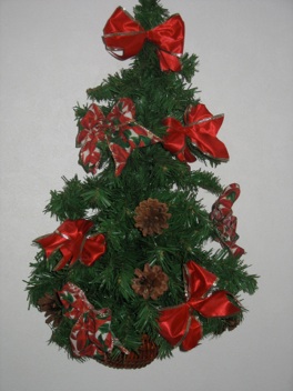 This tree is a regular hundred yen tree with the base removed, and a basket added to hide the remaining base. It is decorated with bows and pine cones fastened on with florist’s wire. The back of the tree is flattened so it hangs against the wall.