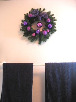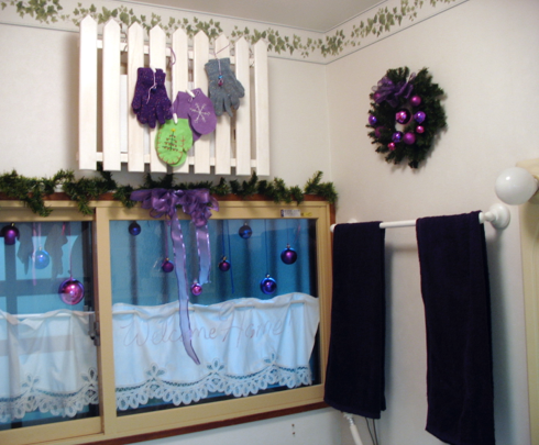 Purple can be a surprising color for Christmas, but you can try it in a smaller room such as a bathroom to see if you like it. To create this look, begin with balls on a wreath and also hang balls in the window. Add a green pine swag to the top of the window along with a purple bow. I made felt mittens and embroidered them with a Christmas tree and snowflake, and hung them from the fence (which hides a breaker box) as if they were drying after a snowball fight. Don't forget to hang purple towels, too. If you like the look, but not the color, just do the same thing, but substitute balls, ribbons, and towels for colors you do like.
