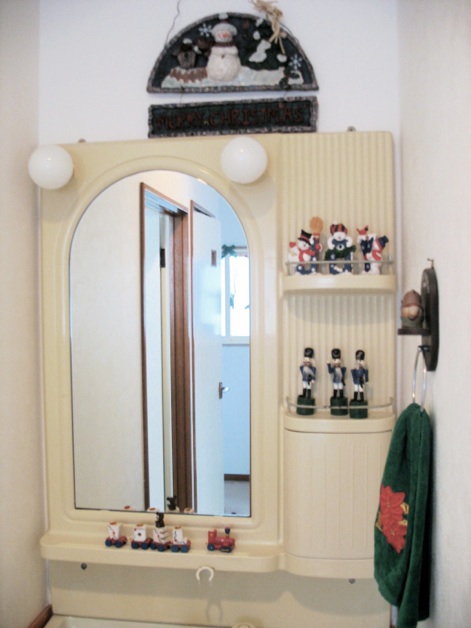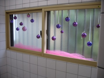 Bathrooms are often overlooked as a place to decorate for Christmas, but often have a lot of little nooks and crannies that are good places to tuck little decorations. These shelves sport snowmen, wooden push toy soldiers (bought at a 100 yen store) a toy train, and a towel embroidered with red poinsettias. If one item looks lonely, line up several of the same item in a row. This is a good place to showcase ornaments that wouldn't be noticed on a busy Christmas tree.