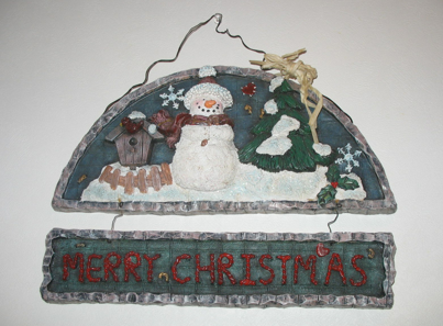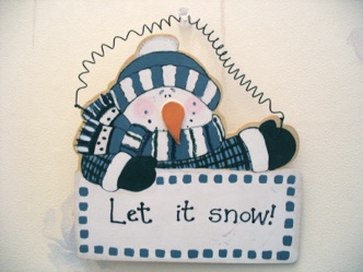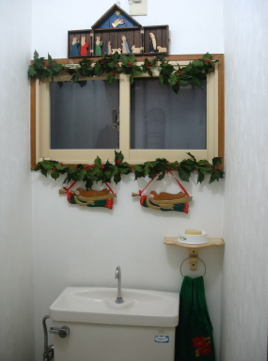 This is a small wooden plaque that hangs right above the toilet paper. It would work just as well over a light switch or on a bulletin board. Any small flat ornament would work here as well. If you like this particular item, but don't have a source to buy wooden plaques, you could buy a sheet of EVA foam which cuts easily with scissors, and paint a similar design on it. (EVA foam comes in a variety of colors and thicknesses, and is sold at some 100 yen stores, dollar stores, and most craft stores.) Another option is to buy a wooden plaque, sold at many 100 yen stores as well as craft stores, and paint a snowman and message on that, though it would not have the snowman shape.