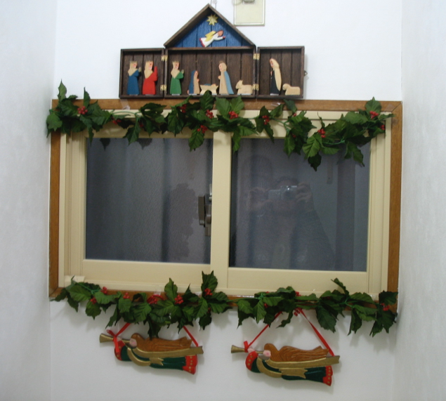 Windows are good places to decorate, especially in small rooms where the window has no view, or has frosted glass. Add a swag of holly or pine to the top or bottom, or both. This nativity set did come with a hook, and works well as a wall hanging. The two angels add interest below the window as well. Just because you don't have these particular items doesn't mean you can't use the idea--look around for items that you like and want to showcase. Keep experimenting until you find a look you like.
