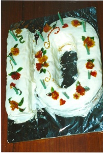 I decorated this 10 cake with “fruit by the foot” shaped into flowers and leaves.