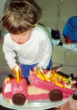 When he turned 3, I made him a dump truck cake filled with candy. I made the layers in loaf pans, and added cookie tires. You could buy pound cake instead of baking it yourself. The bed of the truck is on a layer of cardboard covered in foil and supported by short dowels.