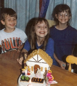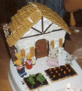 My daughter loved sylvania animals, so I bought her some new ones and put them in front of the house cake. I do have a house cake pan, but it is so deep that it is hard to get the middle baked and the outside not burned. I think it would be much easier to make 3 square layers, and trim the top layer into a peak. The roof is covered in graham crackers, and the decorations on the house are made of chocolate covered pretzel sticks and cookies. The garden in the front is made of more graham crackers with crushed oreo cookies for dirt, and what looks like real lettuce and carrot bits. (I don’t remember!) It would probably be tastier to make them from marzipan or fondant. If I had been feeding a crowd, I would have put the house cake on a sheet cake, and decorated the whole sheet cake like a garden, and I would have put a cookie fence around the edge.