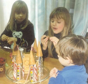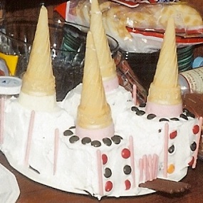 Castle cakes are always fun, whether it’s a birthday for a pirate, knight, or princess. They are fun for Christmas, too. All you need is ice cream cones and lots of cookies and candy for decorations. The one on the left was the made the easy way: no cake--just a cardboard frame covered in tinfoil (and paper towel tubes for the turrets.) The one on the right is made with cake. Bought poundcake makes it even easier than the cardboard foil version!