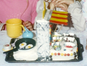 My daughter couldn’t decide if she wanted a kitchen cake or a candy store cake, so I made 2 sides to the cake. A toy pan and kettle were put on the cake “stove.” The fried eggs in the pan are sliced marshmallows with with yellow m’n’m’s for the yolks. The candy store has a paper canopy and muffin liners hold 6 kinds of candy.