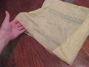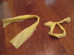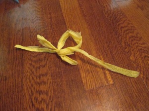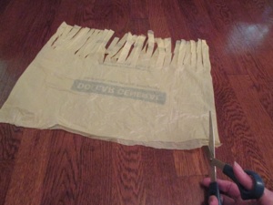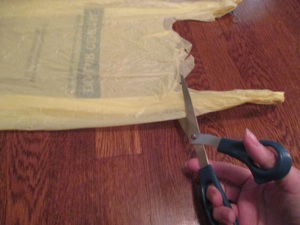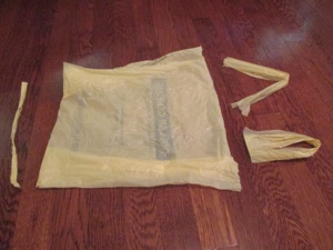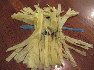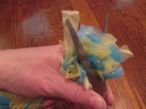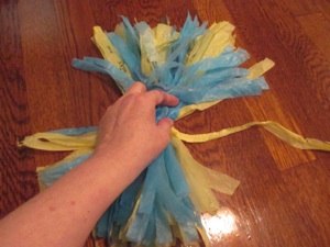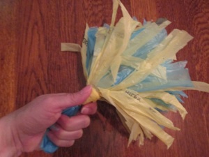 Gather the middle uncut part of the bag and tie it in the middle with the bottom seam of the bag. I used a different color of bag for these parts to make them easier to see and distinguish from the rest of the pom-pom. String will work fine for this as well.