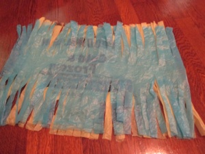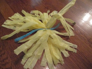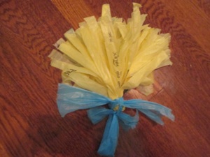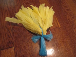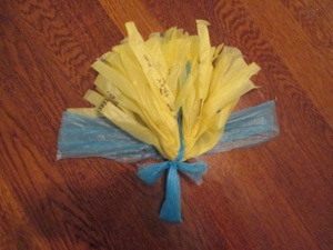 Make pompoms out of recycled shopping bags --it only takes a few minutes. Don’t worry if there is writing on the bags--it doesn’t really show.