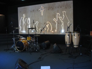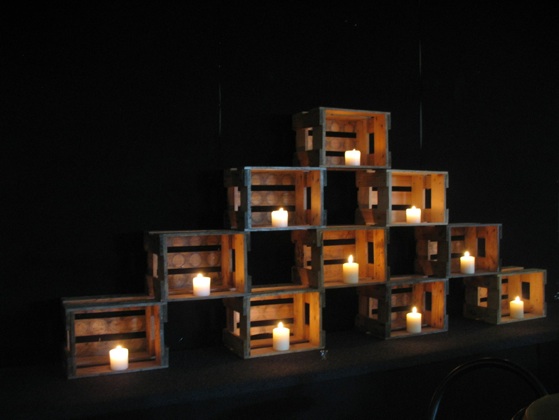 Here is a christmas tree made out of old wooden crates and pillar candles that give off a wonderful glow. I love this idea because it is so easy to achieve--no handyman needed! The candles are easy to find-- just about every dollar store sells this size of candles. I have no idea where to find old wooden crates--maybe you can google it to find a source in your area. If not, you can always get a handyman to build some! I do have two thoughts on this--your church has to be quite dark for the candles to show up and give this warm glow, or plan to light them during an evening service. The other thing is safety, since they are real flames. Perhaps one person could be put in charge of lightning and extinguishing them, but also in between, keeping an eye on them during the worship service to make sure people don’t get too close for their clothes to catch on fire, or bump them and knock them over. Be sure to keep a fire extinguisher handy. The alternative is to use electric candles--they don’t look as pretty, but they are not a fire hazard.