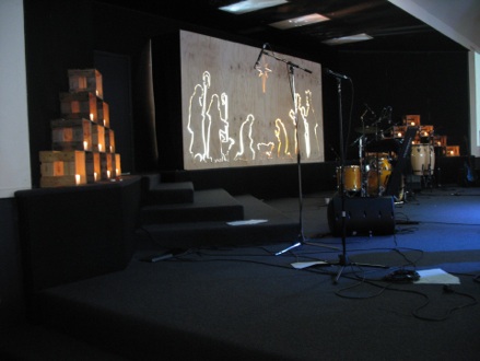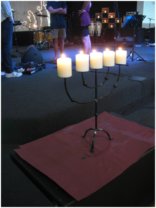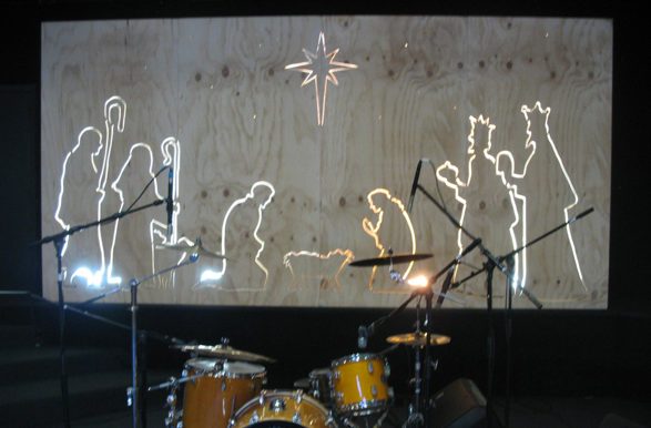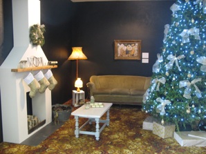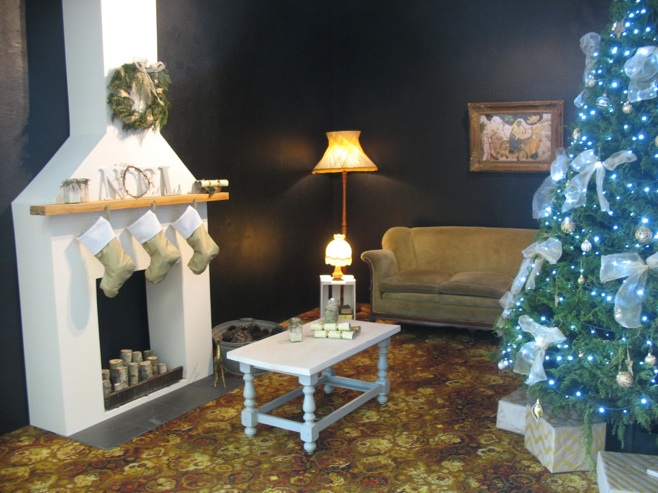 If you have builders in the church, they can make a decorative fireplace to add to the ambience. If your church doesn’t have builders, or if they are busy, you might be able to find an old mantle at a flee market or junk store. You would still need to find a wall or oversized box that you could temporarily fasten it to.