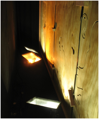 Here is a view of the back side of the nativity scene so you can see the large floodlights that shine light through the cut lines. You can also see the frame around the edges of the wood as well as the smaller pieces of wood that brace the seams in the plywood sheets.