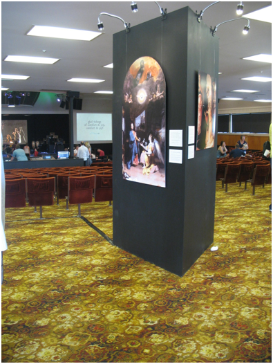 Decorating the church with classical prints of Christmas scenes adds a classy touch to the church. If you are short on wall space to hang framed prints, this 3 sided stand is a great way to display them in a church foyer or entryway. It allows people to view the artwork, but still allows for large crowds to be able to move past them. The lights mounted on the top make the artwork visible even in dark corners. This shouldn’t be too hard of a project for a handyman in the church. If you fasten sheets of plywood together with hinges, then it can fold flat for storage. Or leave it up year round and rotate artwork to match the season.