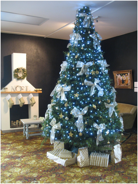 Lots of churches decorate a tree for Christmas. Some churches make the mistake of using a tree intended for homes, and it looks silly in the larger spaces of the church. The one pictured here is the right scale--it reaches right up to the ceiling. Churches, even small churches, are so much bigger than houses that they need really massive decorations in order to not be dwarfed by the surroundings. If you use a tree this big, it is good to use extra large decorations as well. They don’t have to cost a fortune--often dollar stores carry oversized decorations. On the tree in the photo, they used large bows all over the tree between the decorations. You can use this idea if you buy rolls of ribbon at a craft store or even a dollar store-- you can make your own bows quite inexpensively, and they don’t take a lot of time to make. If you can’t buy other large decorations, you can make them, or even use full sized toys as tree ornaments. There are places where you can use smaller trees around the church, such as cozy sitting areas, Sunday school classrooms, or even bathrooms. These can add a nice touch of Christmas spirit all over the church. When choosing decorations for any tree, it is good to keep in mind the surrounding colors of the walls, carpet, drapes, and furniture. If they are neutral colors, then you can use any color for the decorations. If not, try to choose ornaments in colors that will complement the surrounding colors. Of course, if the decorations are neutral, such as gold or silver, they will go with just about any room colors.