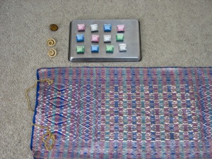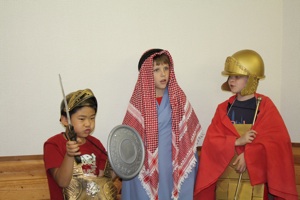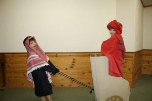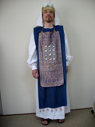 Breastplate--I was fortunate enough to find a woven piece of fabric that was made with gold and blue and red thread. Even if you can’t find something like this, you can probably find some kind of fancy cloth. There is supposed to be one in the front and one in the back, fastened on with gold chains and rings. I only had one, so I used an old costume jewelry necklace and safety pinned it to the two top corners and around the neck. I added some gold tone earrings for the rings. The 12 “gemstones” are magnets from the hundred yen store. Since I also use this fabric to represent the torn temple curtain at Easter, I did not want to glue the gemstones to the cloth. So I put a small stainless steel cookie sheet behind it and held it in place with a belt.
