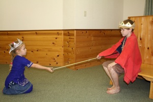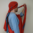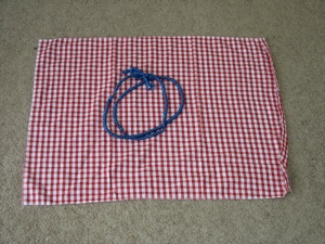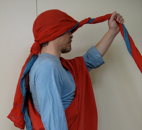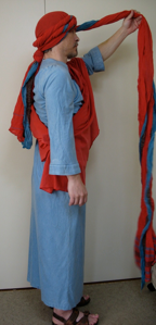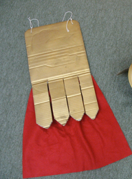 Cape--Cut a piece of red cloth to form the cape (this was an old tablecloth that I was going to throw away when it dawned on me that it would make a great cape for a Bible costume.) Fasten a chain or string at the shoulders with two safety pins. You can fold it to different lengths before you fasten it at the shoulders, depending on the height of the person. The cape is not essential, but it does cover up your street clothes, so the costume doesn’t have to be complete.
