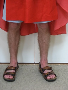 Sandals--Any kind of leather sandals that are fastened with velcro can fit lots of shoe sizes. Occasionally you can find Roman-style sandals in shoe stores. When I found a pair at Walmart, I bought it on the spot--I figured that was the cheapest pair of period shoes I would ever find! But if you can’t find these kind of sandals, cut straps to wrap around your legs and wear flip-flops or sandals you already own.
