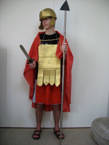 Breastplate--cut 2 sides from a cardboard box and cut one side into strips and trim the ends into points. Spray paint gold. Poke 2 holes in the top and tie them with a string to fit around your neck. Glue or tape a square of felt to the back of the breastplate. Try to gather it a little as you glue it on. Wear shorts or roll up your pants so they don’t show below the red “skirt.”