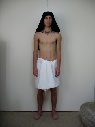 Robe--Use a baptismal robe, or make a simple robe with elastic or drawstring neck and wrist openings. (sheets may be the cheapest fabric.) The one shown here happens to be an old bathrobe. If you use a wrap around bathrobe, fasten it with pins or something so it doesn’t come open in the middle of the show!