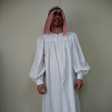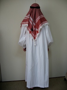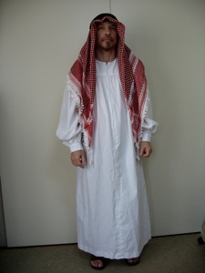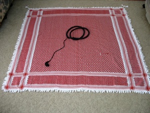 Headdress--I was fortunate enough to be able to buy a real middle eastern headdress. White works just as well. If you want a red checked one, just buy a large square of fabric. If you really want to get realistic, sew on a fringe along the edge, and a tassel in every corner. The black rings that hold on the cloth are hard and do not stretch. I you can use a bungie cord in place of this.