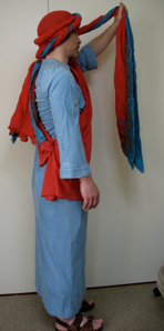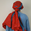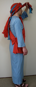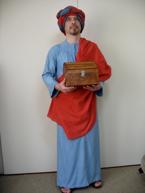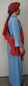 Optional Tunic--This one is an old tablecloth that I was going to throw away anyway. It matched the turban, so I wrapped it around one shoulder and pinned it. Mohamar Kadafi might be a person to provide inspiration for many costumes! Another option is to make a tunic like the high priest has on in the photo above.