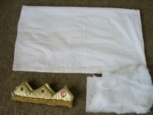 Crown--a pillowcase works great for this. Just put some batting on top of the head to puff it up a little. It is held in place with a gold crown. I sewed one out of gold fabric for my children to play dress-up when they were young. It adjusts to head size with a bit of elastic in the back. But any toy crown that will fit over an adult head along with a pillowcase will work.