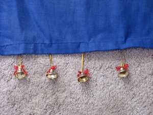 Tunic--Cut a piece of blue cloth to cover the front and back of the priest. Cut a neck hole, with a slit to make it fit over the head. If you don’t use the costume much, you can get away with not hemming the edges. Otherwise, use wonderweb or some kind of iron on bonding, or finish the edges with sewing. Fasten bells to the bottom of the tunic. I used Christmas tree ornament bells from a hundred yen store. You may want to pin these on with safety pins rather than sew them on, which would allow fairly simple removal so you can wash the costume.