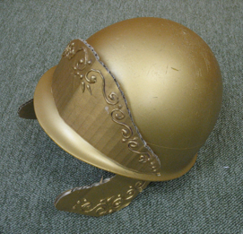 Helmet--this was just a construction helmet that I got second hand and sprayed with gold spray paint. The piece across the front and the cheek guards are cut out of cardboard, designs drawn with glue, and once that dried, spray painted gold. The pieces were taped to the helmet. (I think I actually used a glue gun to make the design, if I remember correctly, because I am always in a hurry. But white glue works, too--you just have to wait longer for it to dry.)