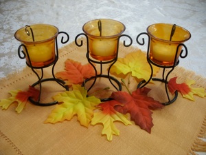 More centerpiece ideas from the hundred yen store: An orange glass candle stand that holds a tea light is the perfect color, but would look too sparse if you only use one. However, if you line up 3 in a row, add some leaves and place them all on a napkin, it becomes a quick, inexpensive centerpiece
