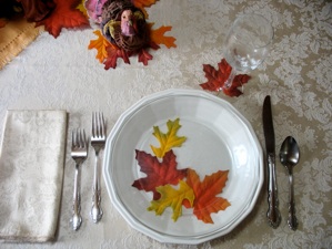 Here, again, table linens are layered to produce a more interesting arrangement. A simple basket of pine cones is enhanced with a brown table runner and 2 orange napkins layered under them. Fall leaves are sandwiched under clear glass plates creating a fall motif for your dinner plates. That way you don’t have to buy seasonal plates, or find a place to store those extra dishes, or spend money to buy paper plates for every special occasion.