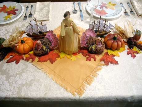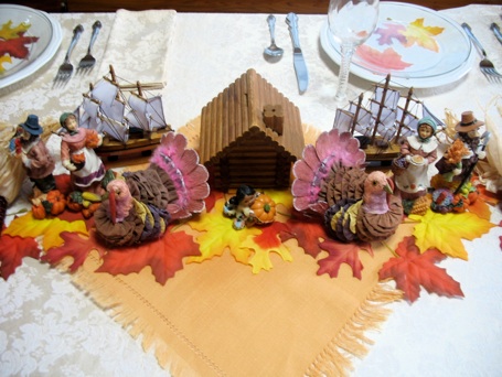 A similar arrangement is achieved with dollar store figureines. The ships represent the Mayflower that brought the pilgrims to America, The turkeys and pumpkins represent the bounty of food for which the pilgrims gave thanks, and became the foods that have come to be associated with modern Thanksgiving dinners.