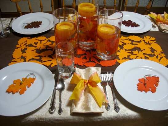 This table setting has many layers. An off white tablecloth goes on the table first. Next comes a brown table runner. On top of that are 3 orange mats with a leaf motif. Then come 3 vases filled with water and “silk” leaves, and each is topped with a floating candle. The felt leaves on the plates could be used for coasters, or as place cards, or simply as a decorative element. All of these items, including the plates, were purchased at 100 yen stores, the only exceptions being the table cloth and silverware.