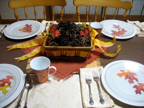The next easiest centerpiece is to get a basket and pile it high with fresh fruits or vegetables. It will not last long in a warm house, so this is a centerpiece that is only good for a day or two. It is layered on top of a brown table runner with a ribbon and felt leaves. Each napkin is tied with more ribbon, and accented with more felt leaves.