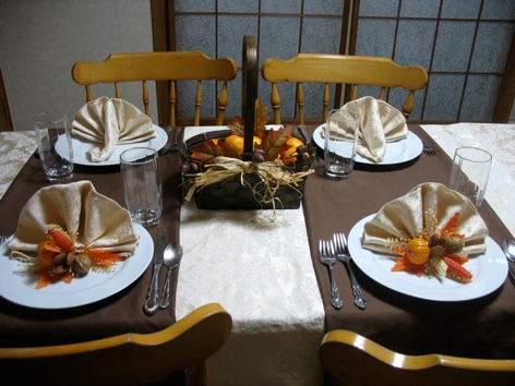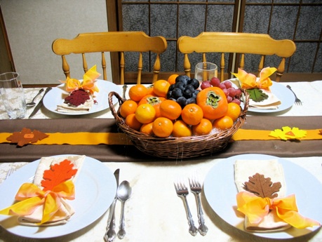 This time the brown table runners go across the table and also act as place mats. The basket is accented with a raffia bow and oak leaves with acorns, and is piled high with oranges. Each plate is topped with a napkin and accented with a floral pick (hundred yen stores as well as department stores sell these in the fall.)