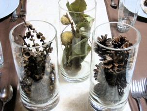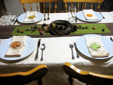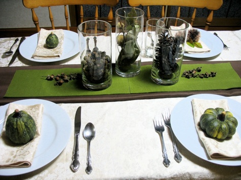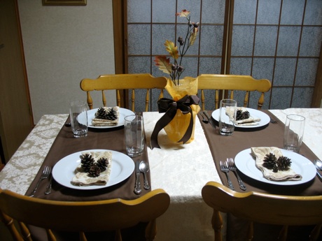 A similar look can be achieved with very different items. Instead of the vases, a wreath accented with leaves, pine cones and acorns becomes the centerpiece. Wooden leaf shapes become napkin rings (from the hundred yen store, of course.)
