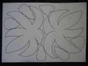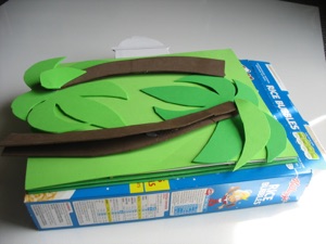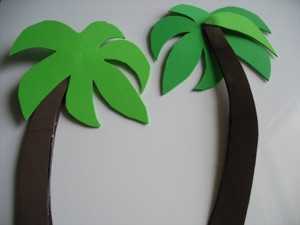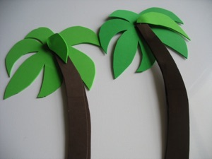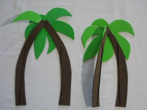 Fold the two sides of the trunks so they line up with each other and glue the palm fronds to the front, and an extra leaf to the backs of the trees to hide the tops of the trunks. (back view shown.)