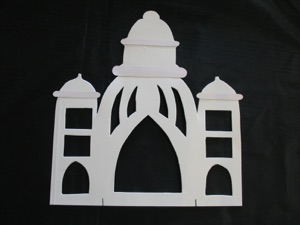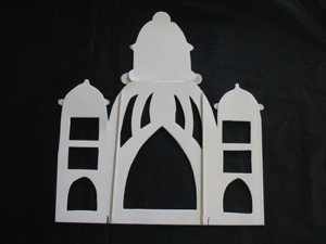Cut the two parts of the domed building according to the pattern. Glue the dome on top of the rest of the building with a strip of foam or thin cardboard to cover the seam. Glue another strip over the seam on the back. Glue more strips to the tops of each dome for decoration. Cut 2 slits on the bottom that will hold braces to make the building stand.