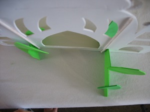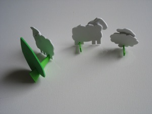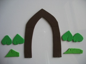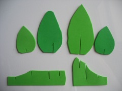 Make the flat barn stand up by making stands from scraps of green foam. Cut 3 notches in the tops of 2 scraps. Cut one notch in the bottoms of each barn leg and the 4 heart shaped bushes. Slide the barn legs into the middle slits, and the bushes into the slits on both ends of the scraps.
