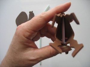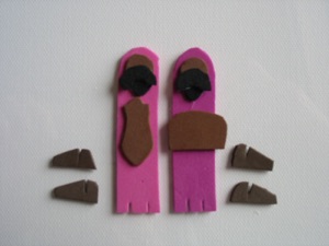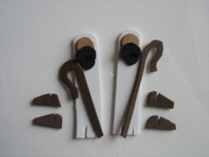 Make stands to look like shoes. Notches hold them together. Cut out staffs, too.