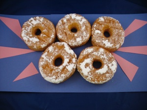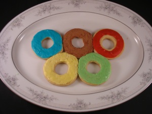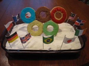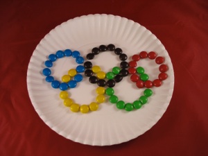 You can buy doughnuts iced in the colors of the olympic rings, or buy plain ones and ice them yourself. If you baulk at putting that much food coloring into your food, you can put a row of M&M’s around the top, or buy Fruit by the foot or other fruit leather to top the doughnuts.