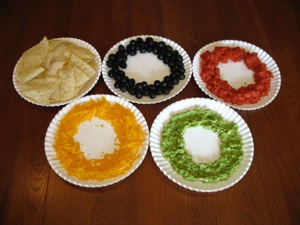 For “Taco” chips, rub flour tortillas with salad oil, cut into wedges, sprinkle with sugar, and bake until crisp. Top with all the yummy toppings, and see who’s dessert looks most like nachos!