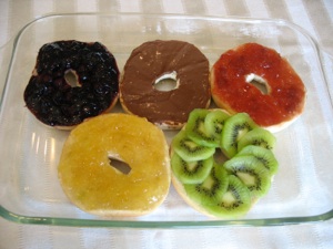 Bagels make the perfect olympic food, since they already come in a ring! Try to come up with toppings that your family loves, then group them into olympic rings for presentation. How about toasting them and top with jam for breakfast?