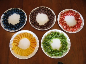 Sort M&M’s or other multicolored candy, then form them into rings on a white plate. You can also put these on top of a sheet cake, but remember that the colors bleed, so put them on at the last minute. They tend to roll around if you move the plate, so be sure to put the plate where you want it before you form the rings, or use icing to “glue” them to the plate.