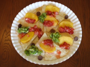 Chop strawberries small to look like salsa. Mango chunks, mango sauce, pudding or yogurt or melted white chocolate mixed with yellow food coloring can all look like cheese sauce for dessert “nachos.”