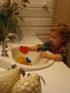 Water play is fascinating to a toddler, and will keep them occupied for remarkably long periods of time. It inevitably makes a mess, but the trade-off of an hour of busy time for 5 minutes of clean up time is totally worth it in my book! It doesn’t have to be at the sink. Just provide different sizes of plastic cups and bowls, with small quantities of water to keep the mess to a minimum. If you have a plastic basin, it can help contain the mess. If it is warm, take the mess outside.