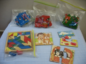 Card sets that are puzzles are available as well--the child tries to find the matching head, body, and feet of different characters. You can make your own with photos of family members. Ask each person to stand against a blank wall, and take a photo that includes everything--from head to foot. When you get the photos developed, cut them into 3 parts. Help your child put the right head with the right body and feet. Then swap them around and laugh at the silly combinations such as baby’s head on daddy’s body and mommy’s feet. Make them even sillier by including photos of their dolls, stuffed animals, or even pets!