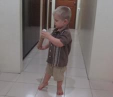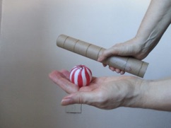 Just throwing a ball and seeing where it goes is fun for this age. If you throw the ball in a hall, the walls keep the balls from getting lost, and it surprises the kids when the ball bounces in unanticipated directions. Variation: Put the ball into a paper towel tube, and flick the ball out of the tube.